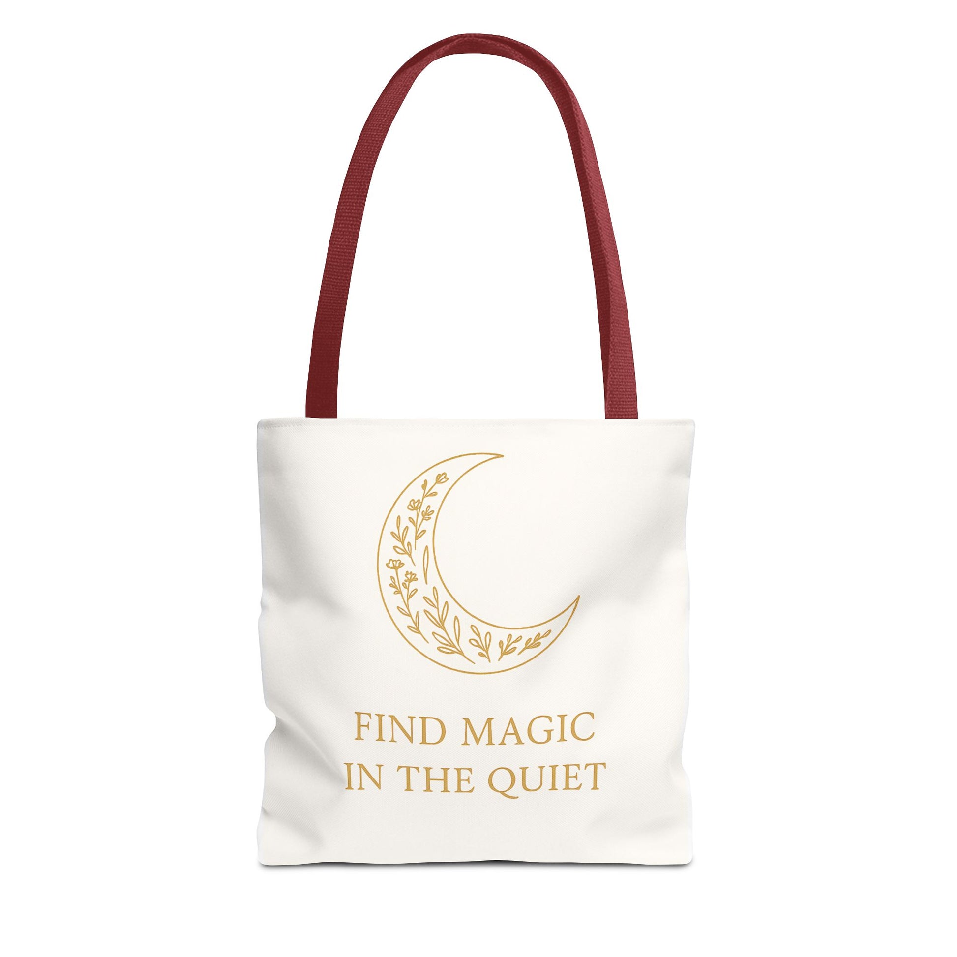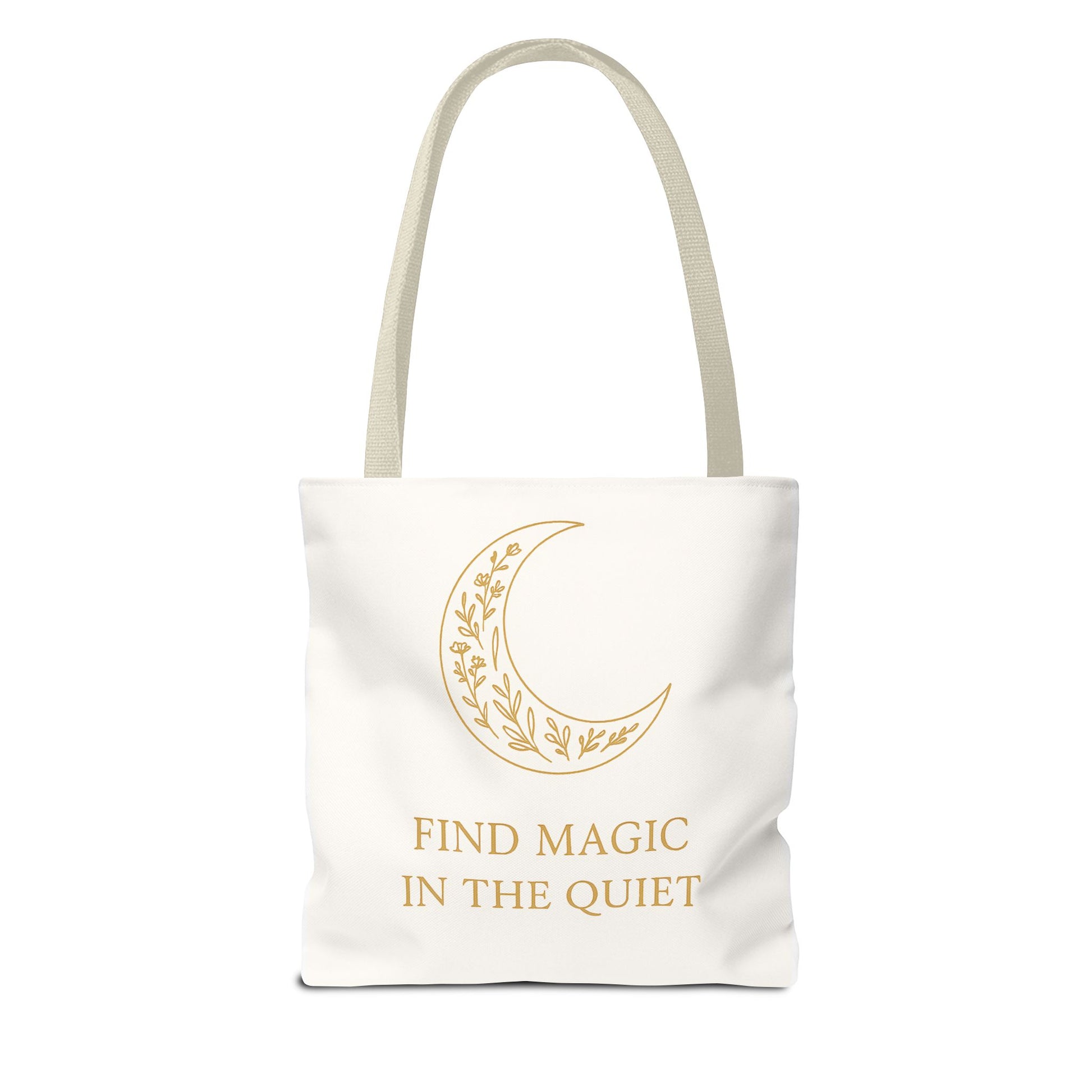 A soft, everyday tote that whispers calm into a busy day. Creamy fabric carries a delicate golden crescent, its vine-like details catching light as you move. Below, the words “FIND MAGIC IN THE QUIET” invite slow moments—library corners, morning coffee runs, or evening strolls—where small rituals matter. The roomy boxed-corner construction and reinforced handles let you pack a journal, a sweater, and a few market finds without losing shape. Choose a handle color that fits your mood and carry a quiet reminder to pause.