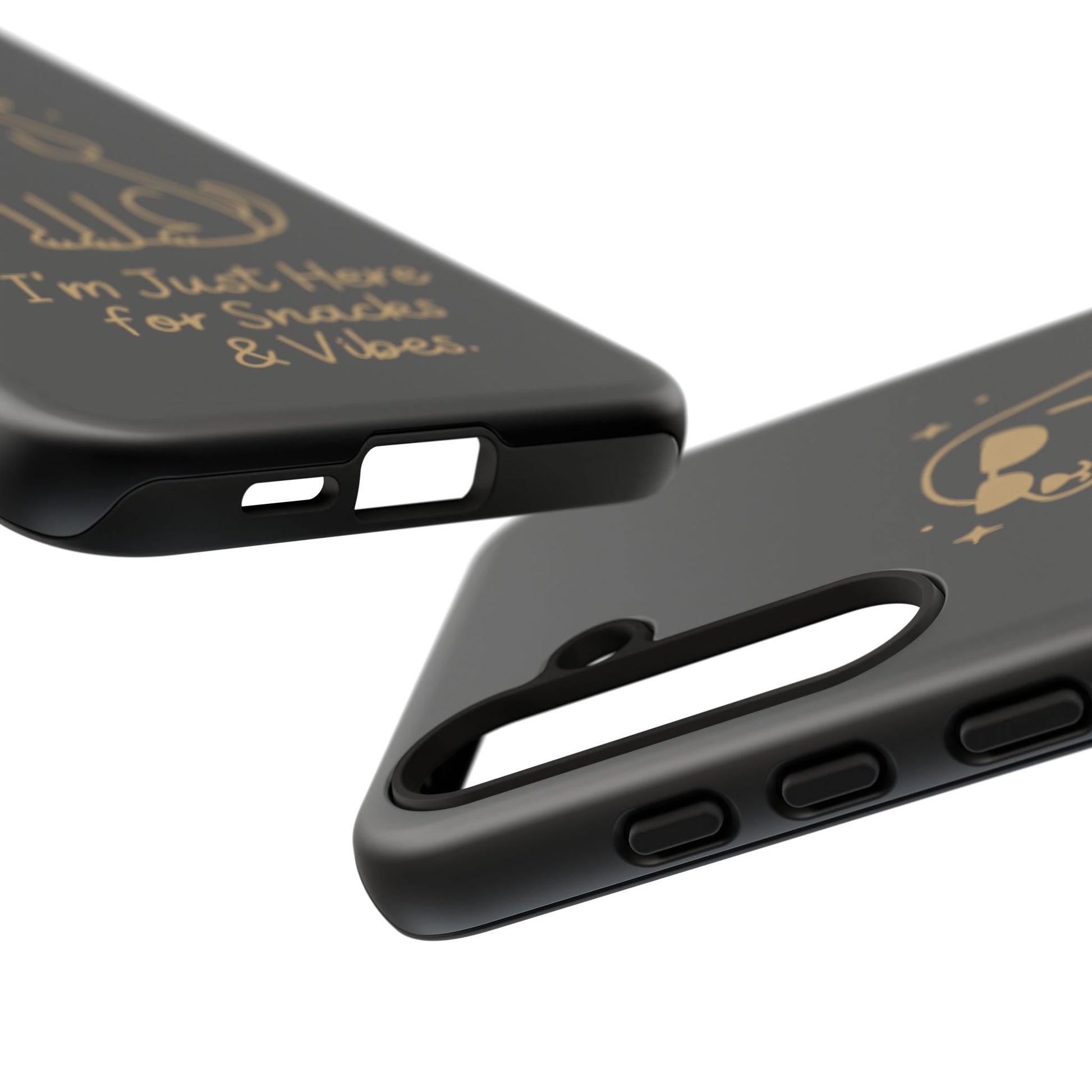 This case belongs with people who move fast but still appreciate small moments: snack breaks between meetings, late-night walks, quick coffee runs, or relaxed hangs at home. The laid-back dog illustration and “I’m Just Here for Snacks & Vibes.” line read like a wink — familiar, unpretentious, funny. It’s built for everyday life: drops, jostles, and the occasional tabletop slide — with handling notes to avoid high-alcohol liquids, prolonged sun exposure, and heavy creams to keep the print at its best.